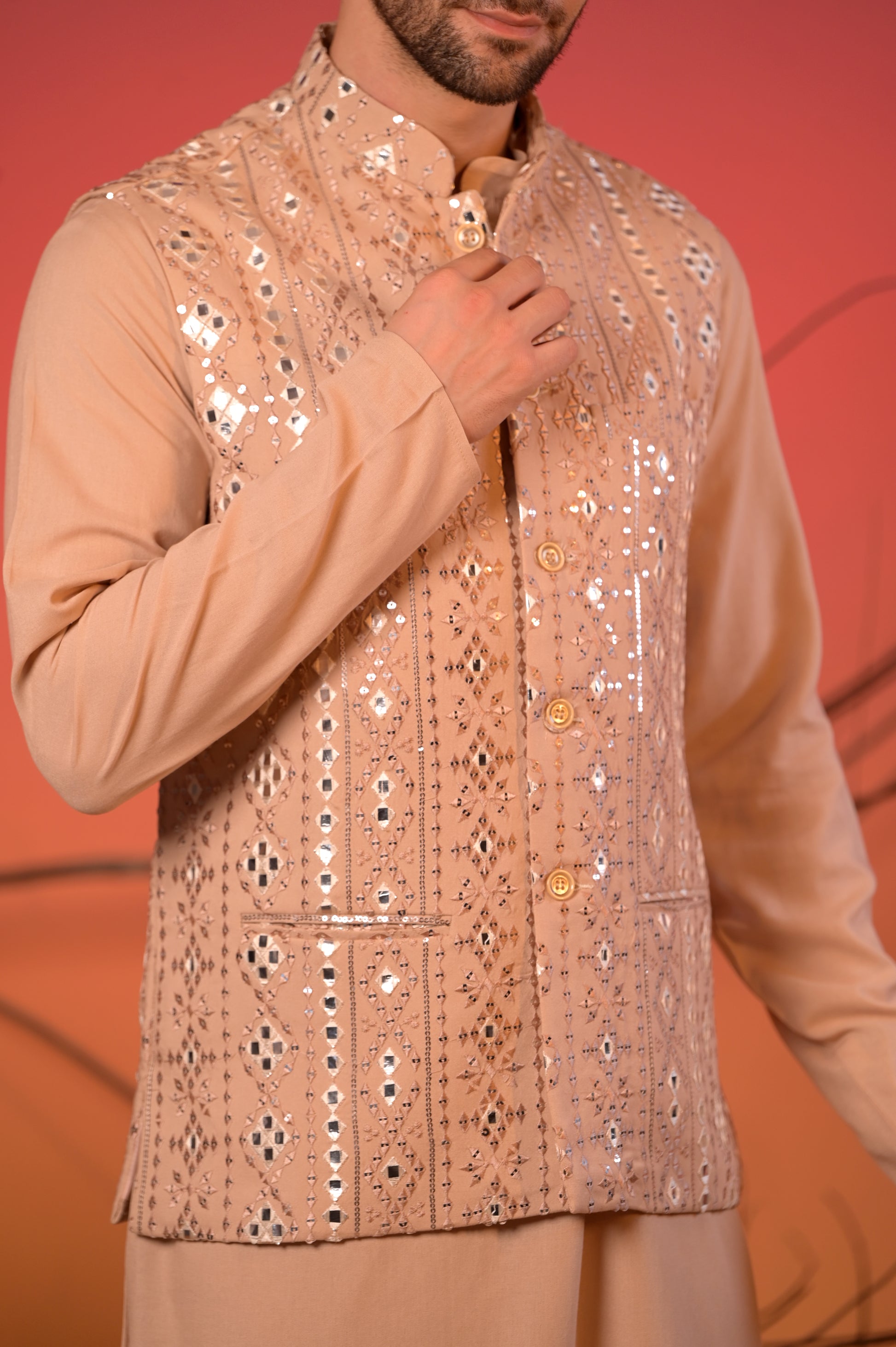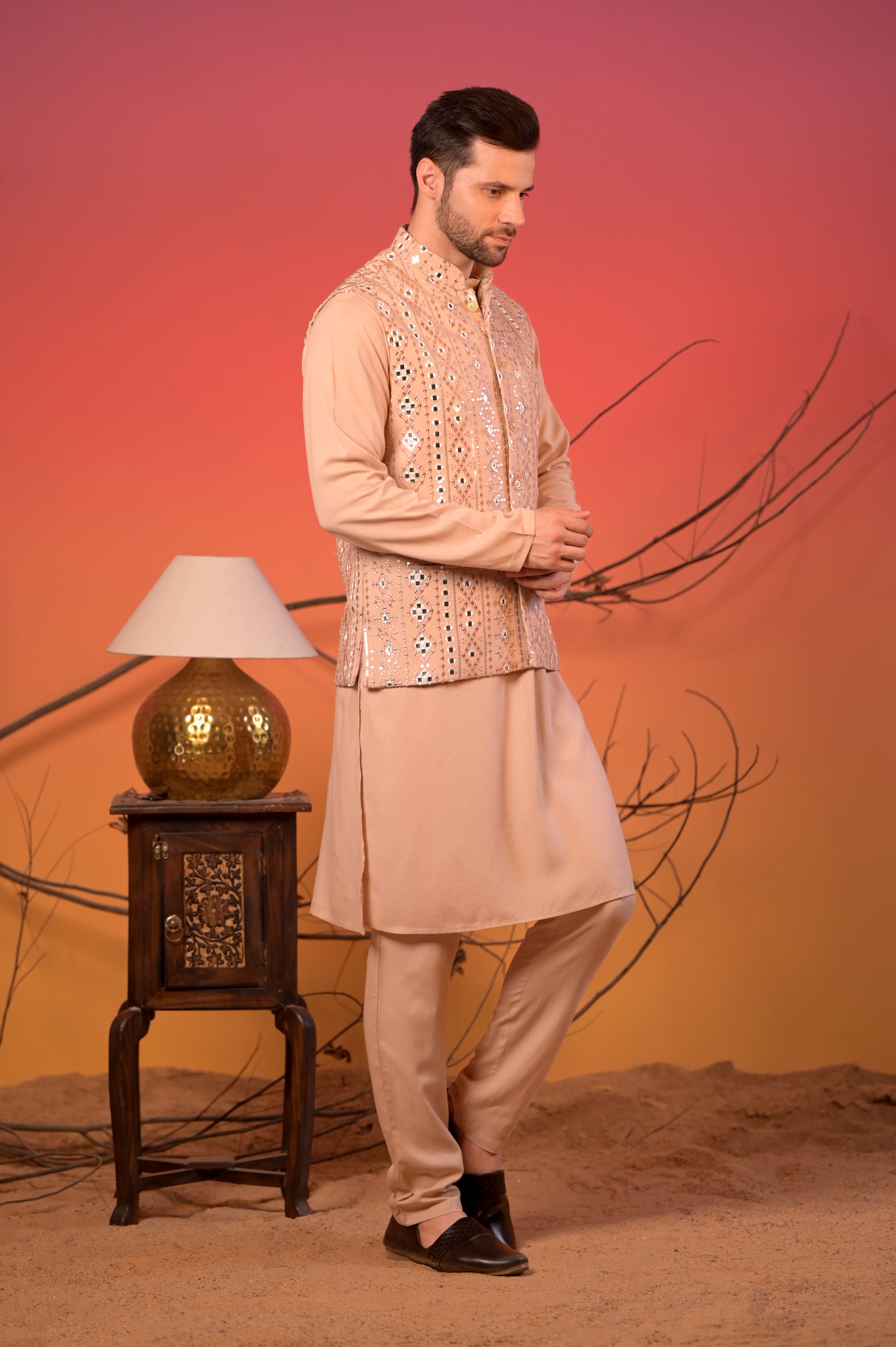 Beige Linen-Silk Kurta with Mirror-Embroidered Nehru Jacket & Trousers Set