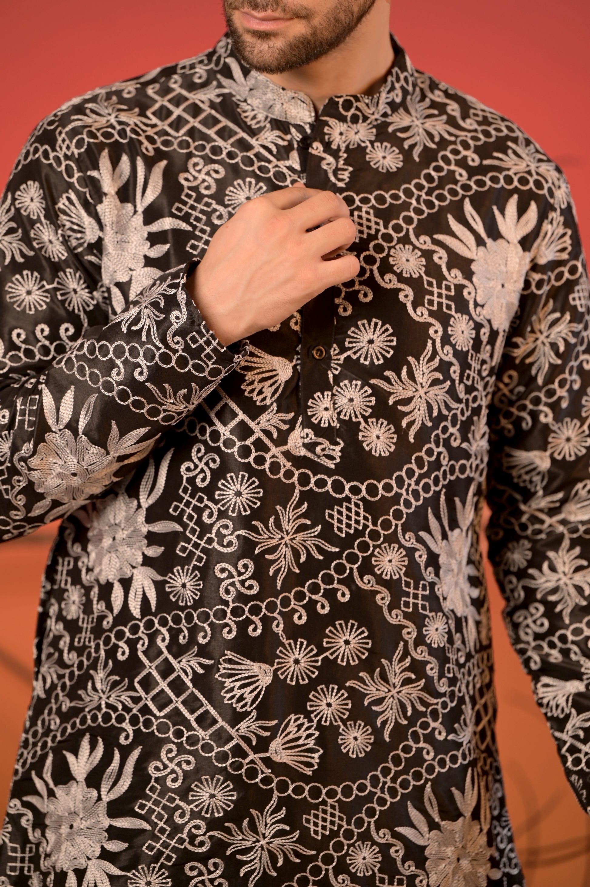 A bold celebration of texture and detail, this black-on-black kurta and jacket set is perfect for evening occasions that demand refinement with an edge. The silk kurta features intricate ivory thread embroidery in floral and abstract patterns, while the Hakoba Nehru jacket adds dimension with tonal cutwork and subtle sequin embellishments. Paired with tailored cream trousers, this ensemble is a commanding choice for weddings, festive nights, and cultural gatherings.