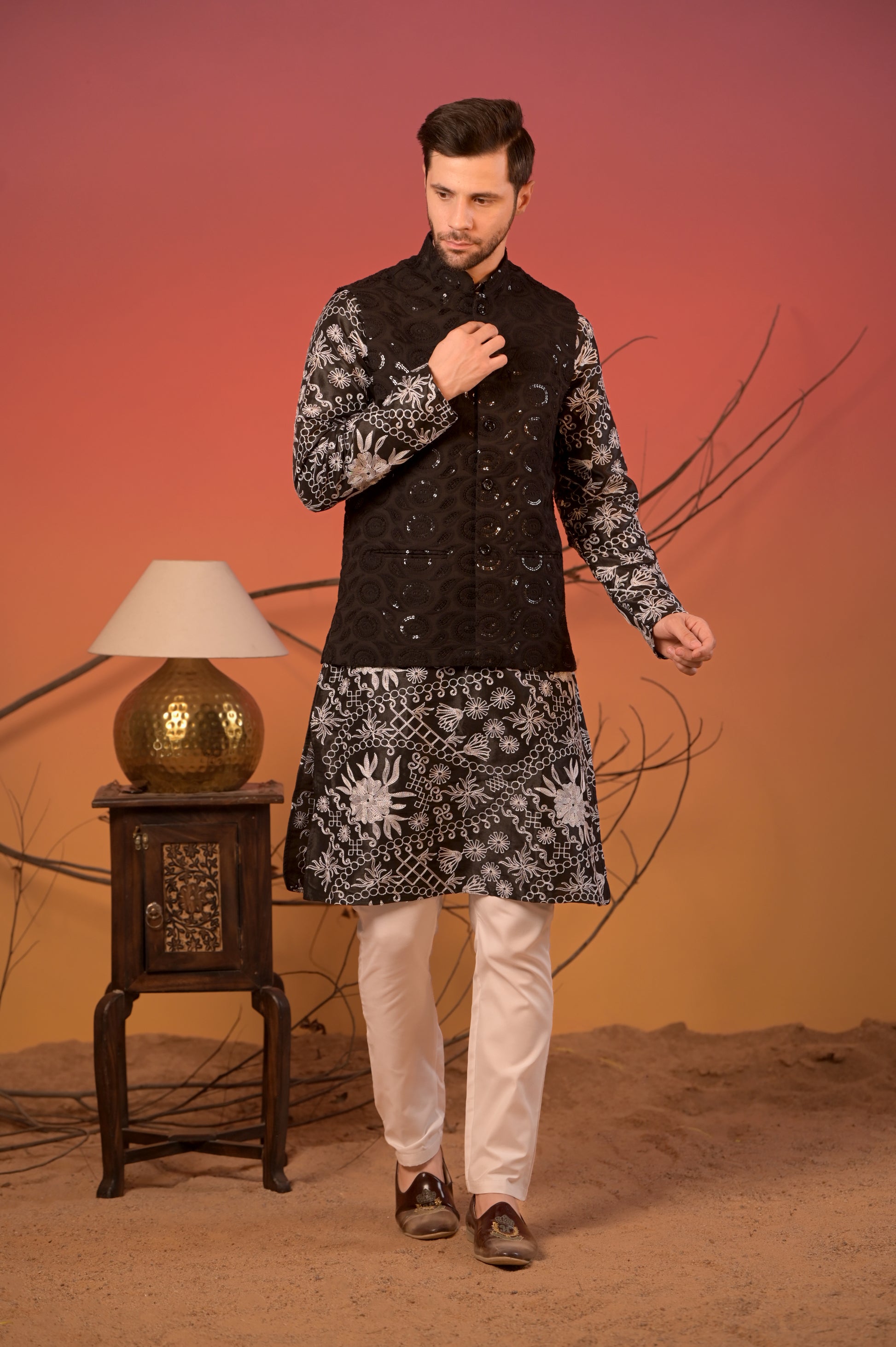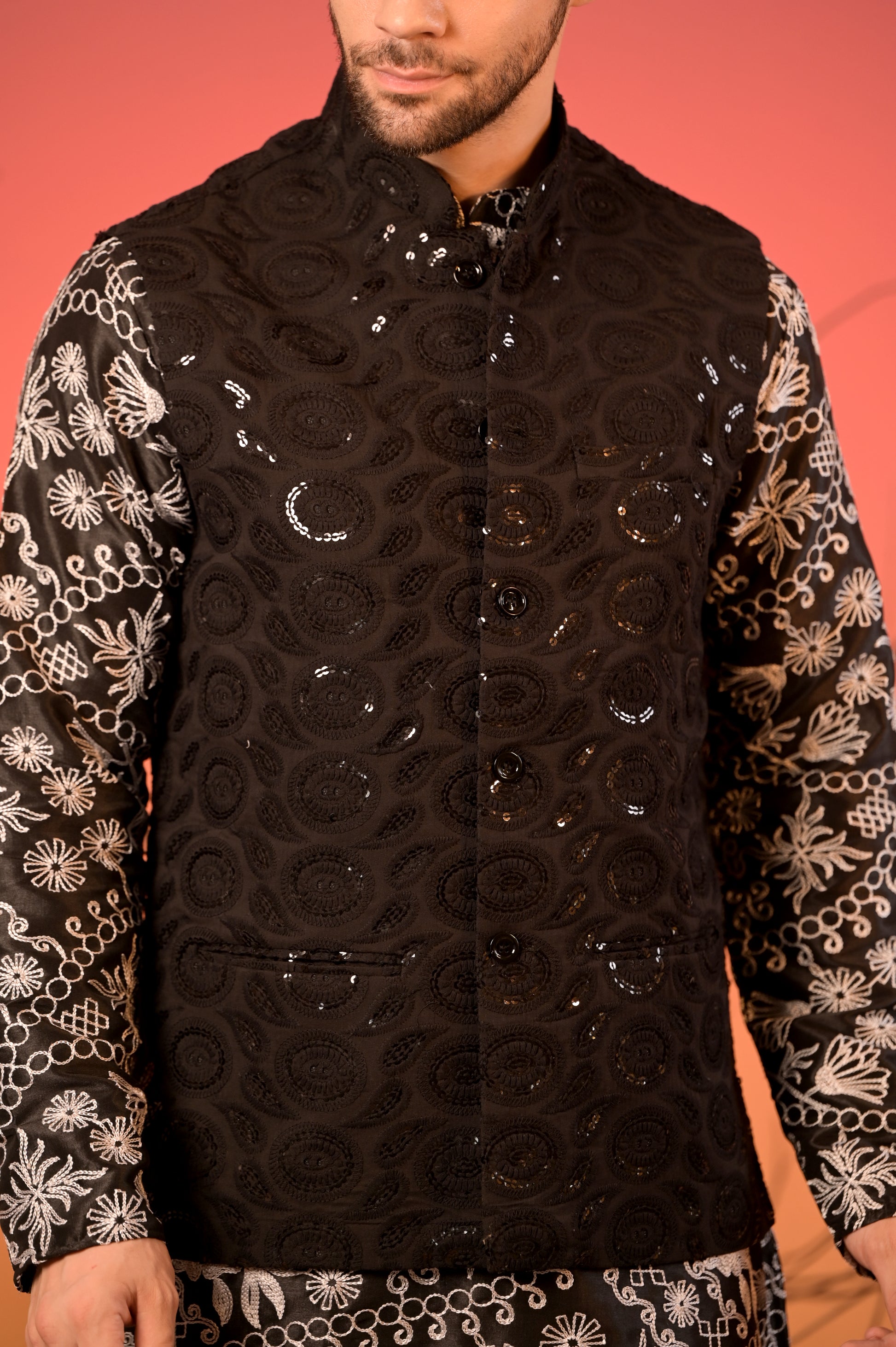 Black Embroidered Silk Kurta with Hakoba Sequin Nehru Jacket & Trousers Set