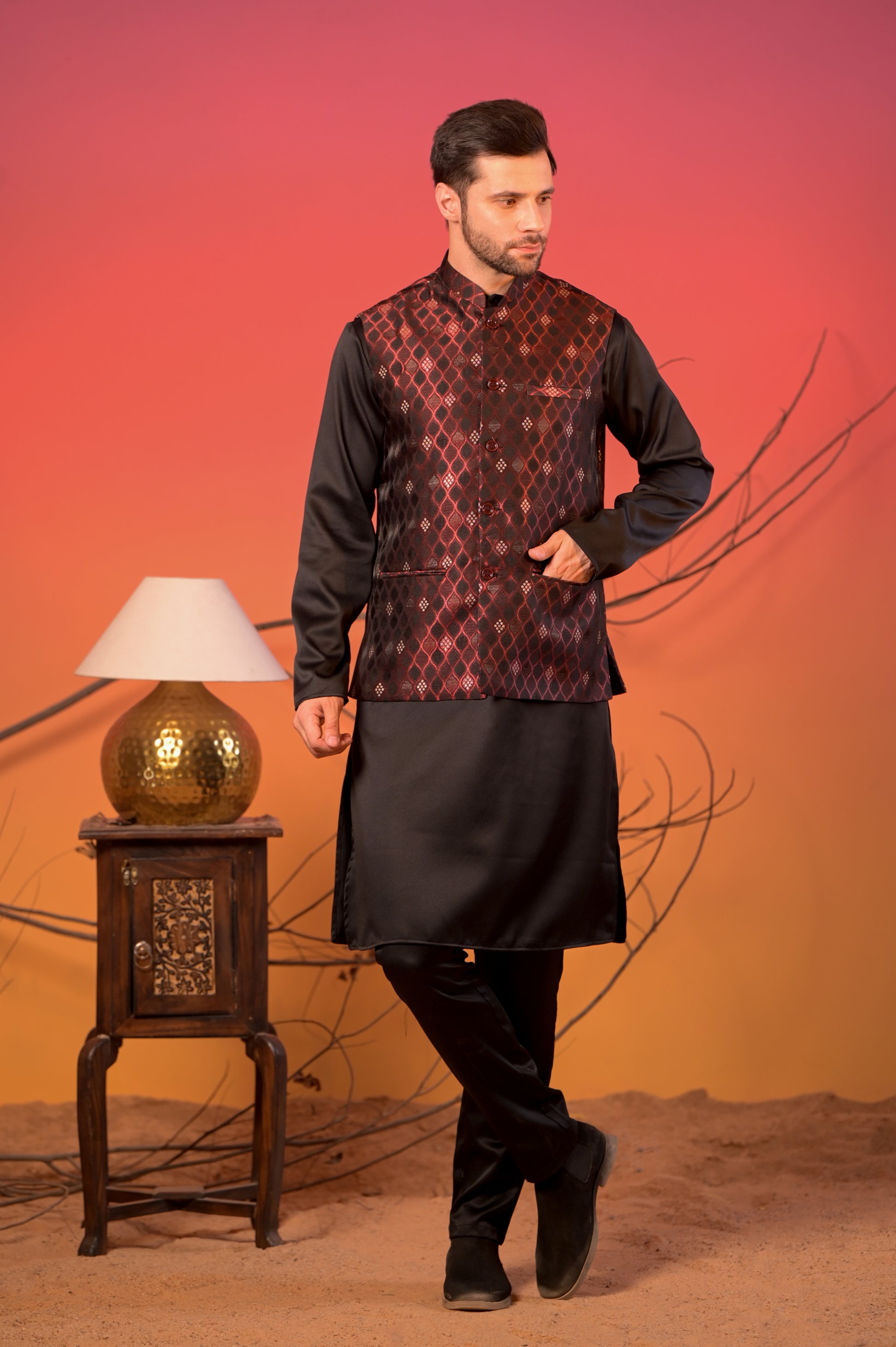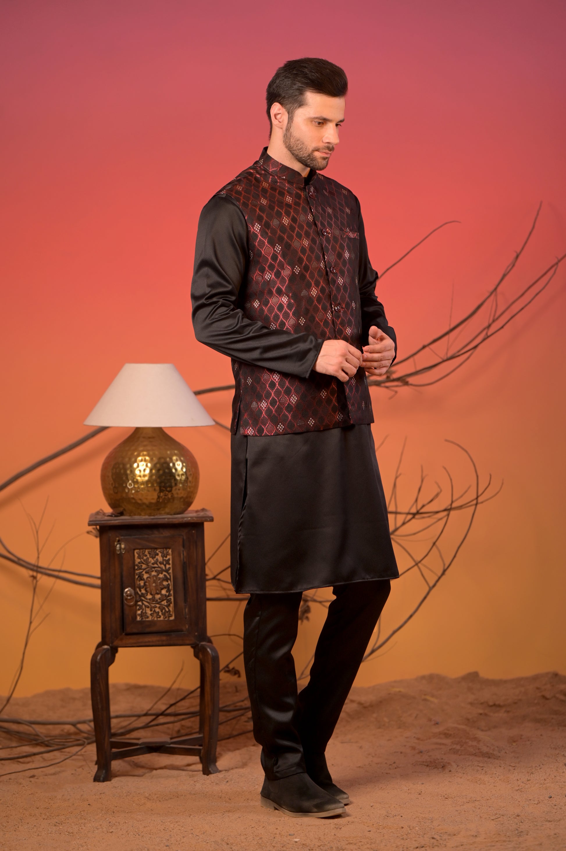 Black Jacquard Kurta with Maroon Diamond Weave Nehru Jacket & Trousers Set