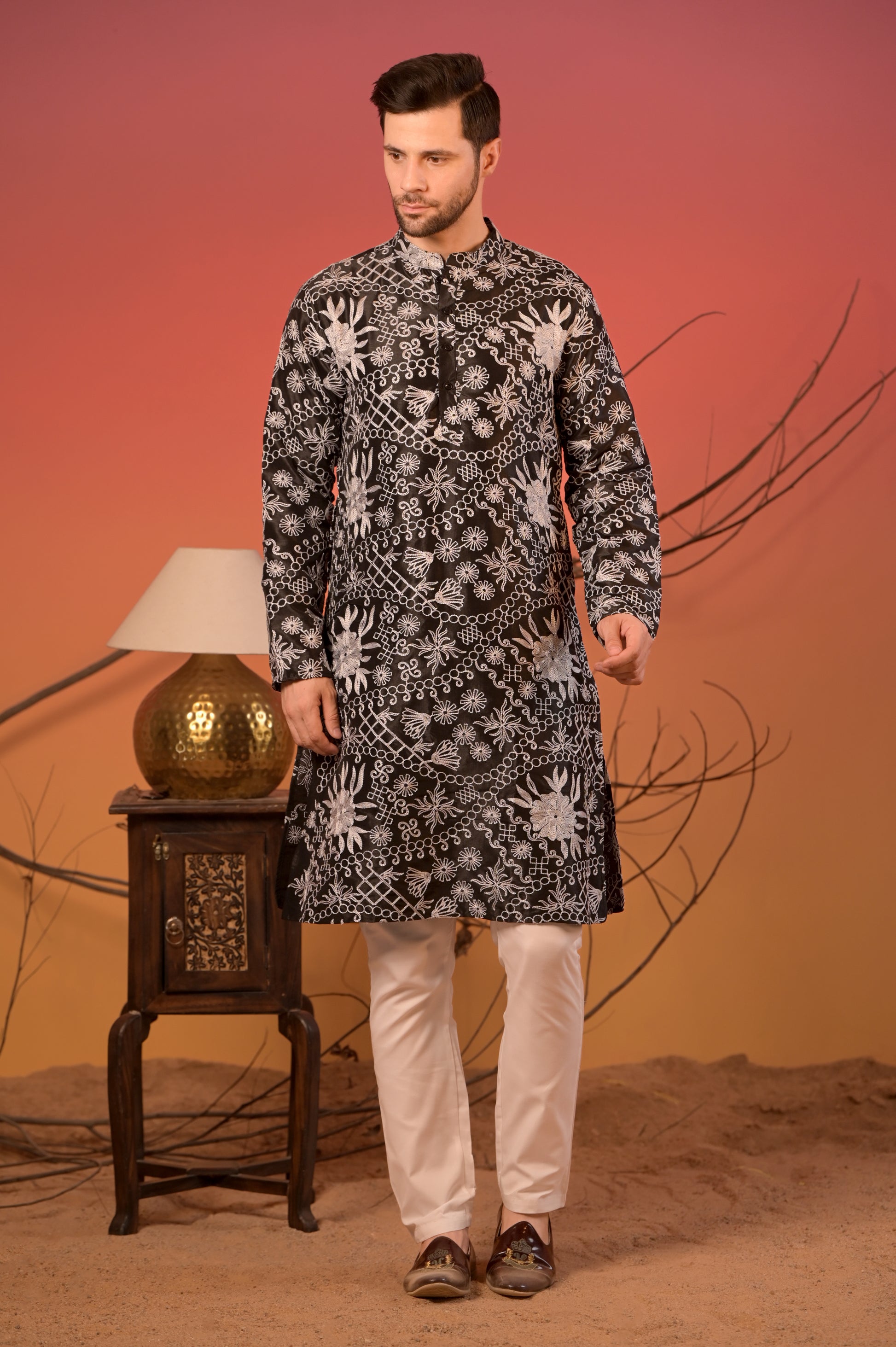 Black Silk Kurta with White Thread Embroidery & Trousers Set
