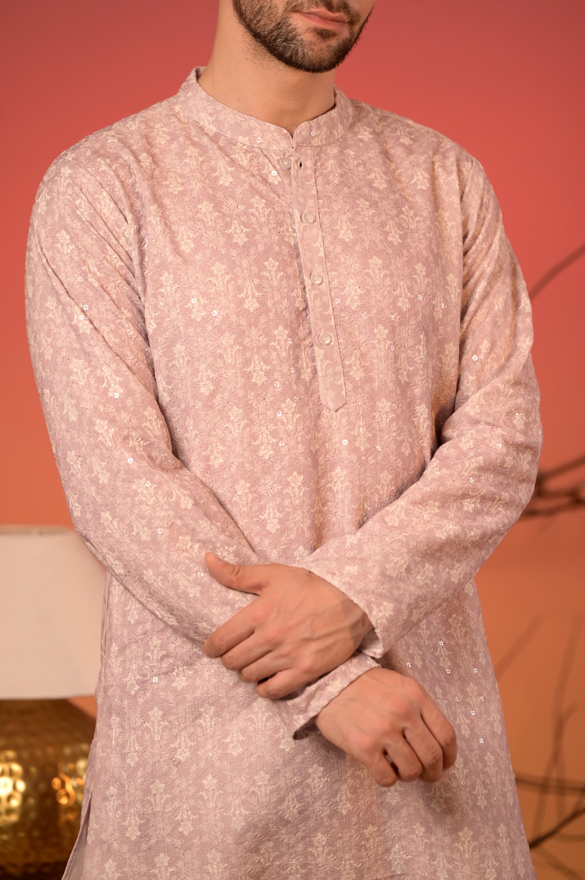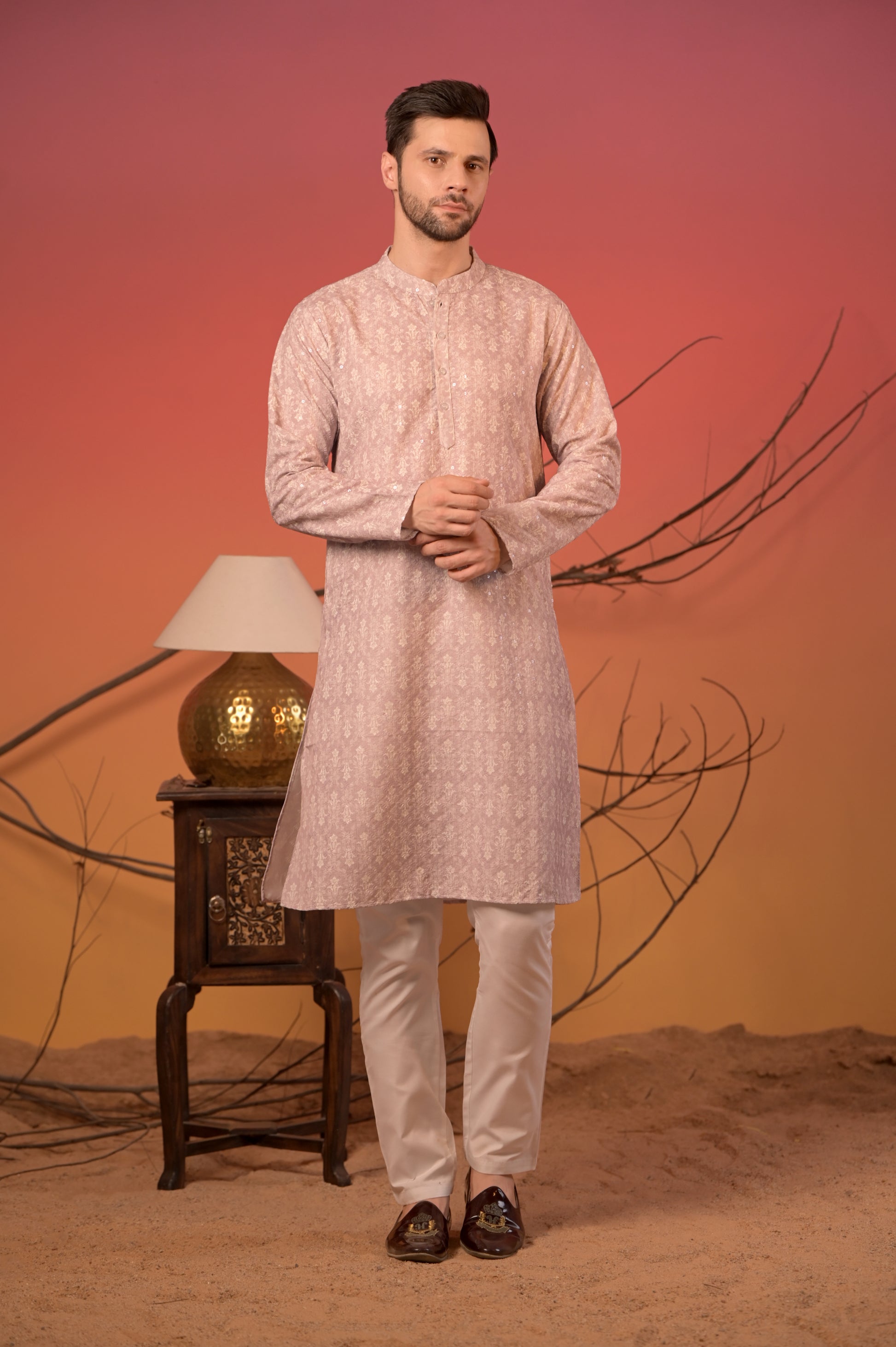 Elevate your ethnic collection with this elegantly understated dusty pink kurta crafted in premium jacquard fabric. Featuring intricate woven patterns and soft sequin accents, this kurta shimmers subtly without overpowering its refined texture. Perfect for intimate festive gatherings, pastel-themed occasions, or elegant evening functions. The breathable weave and soft finish ensure comfort while the straight silhouette flatters every build. Pair with ivory trousers and loafers for a contemporary ethnic ensemble.
