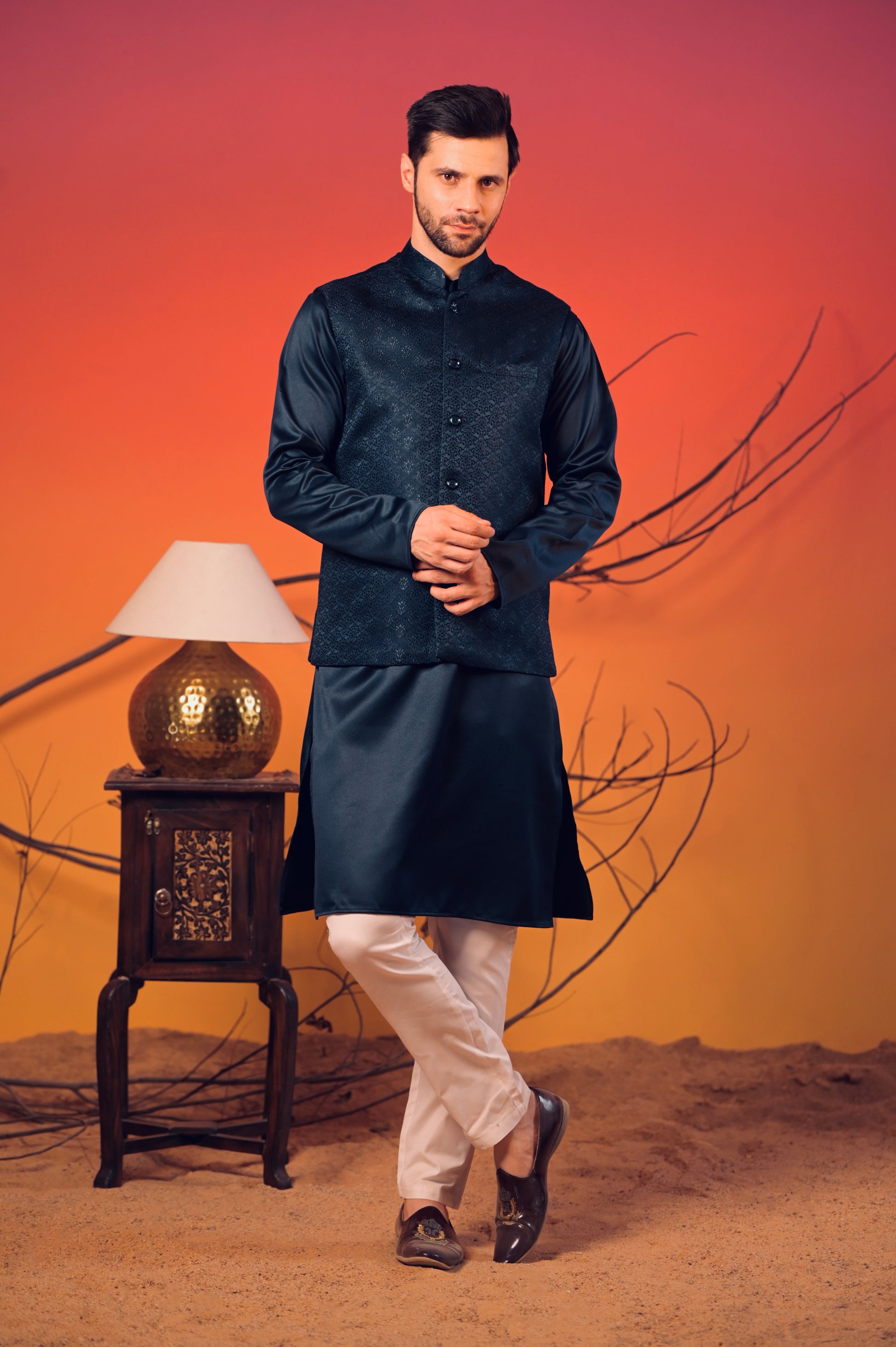 Midnight Blue Silk Kurta with Matching Jacquard Nehru Jacket & White Trousers Set