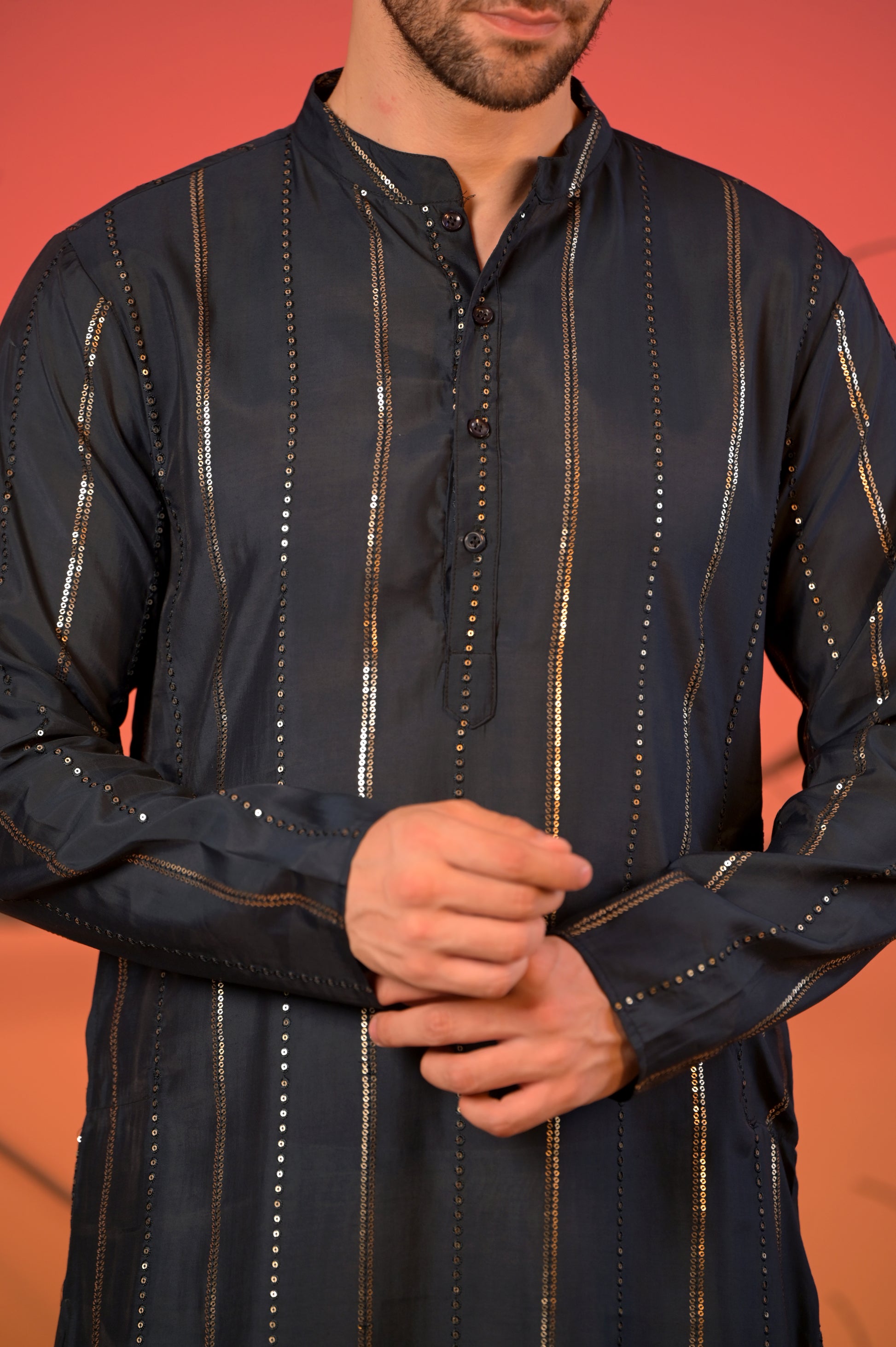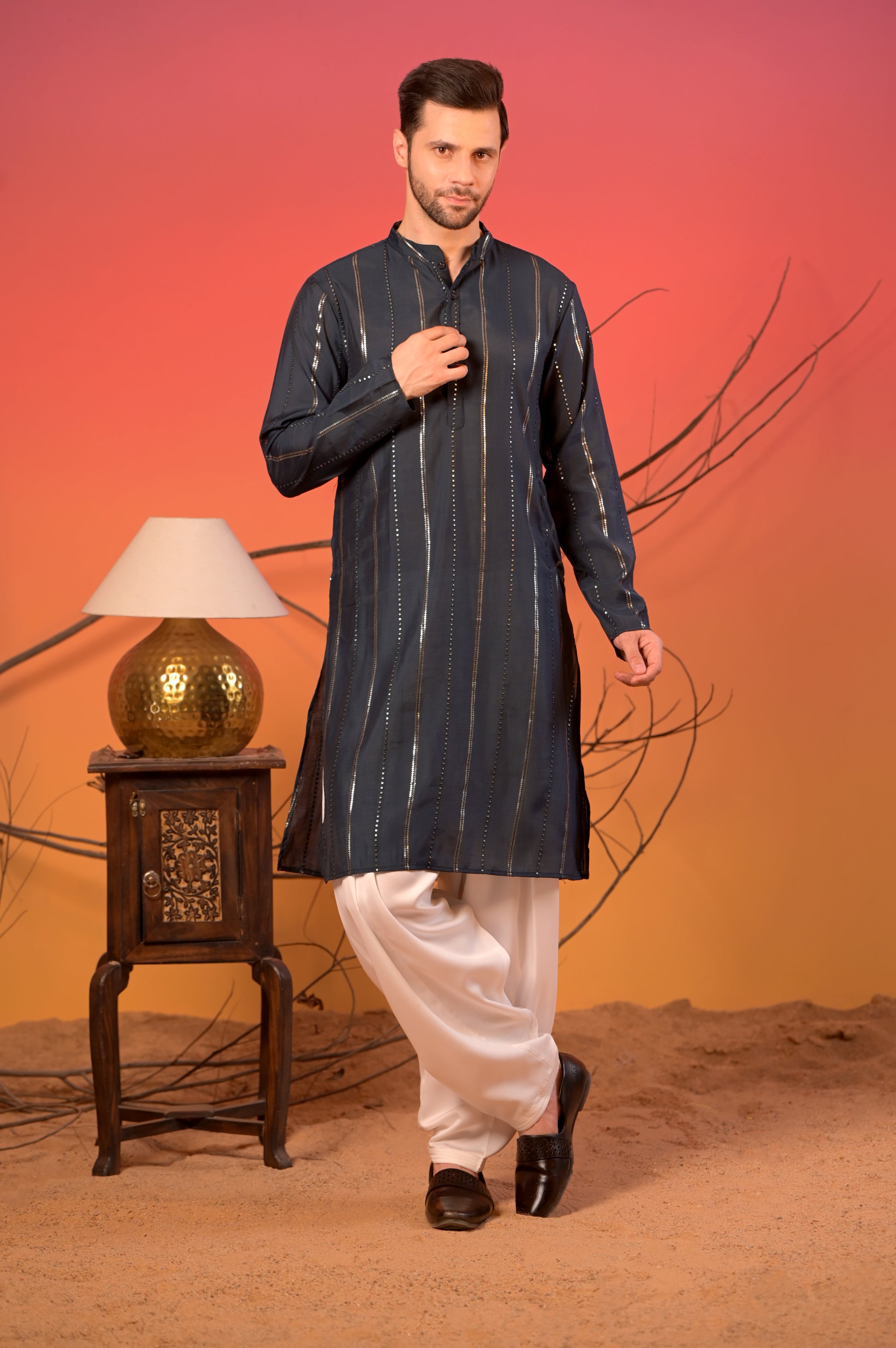 Make an unforgettable impression with this refined kurta-salwar set in deep midnight blue. Crafted from premium silk, the kurta boasts vertical stripes of sequin and thread work that subtly glimmer with movement. Its elegant mandarin collar and rich texture strike the perfect balance between classic tradition and festive flair.