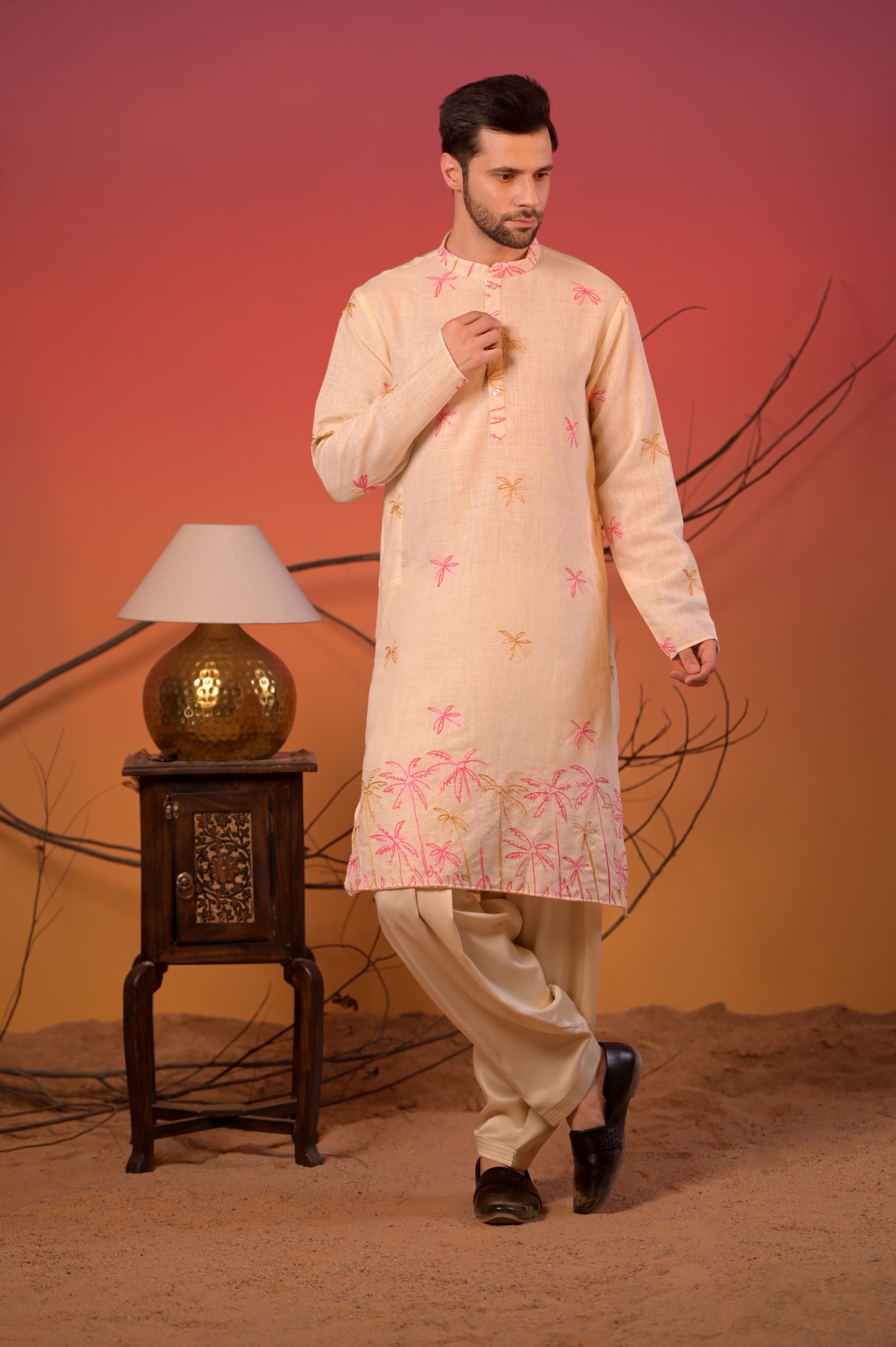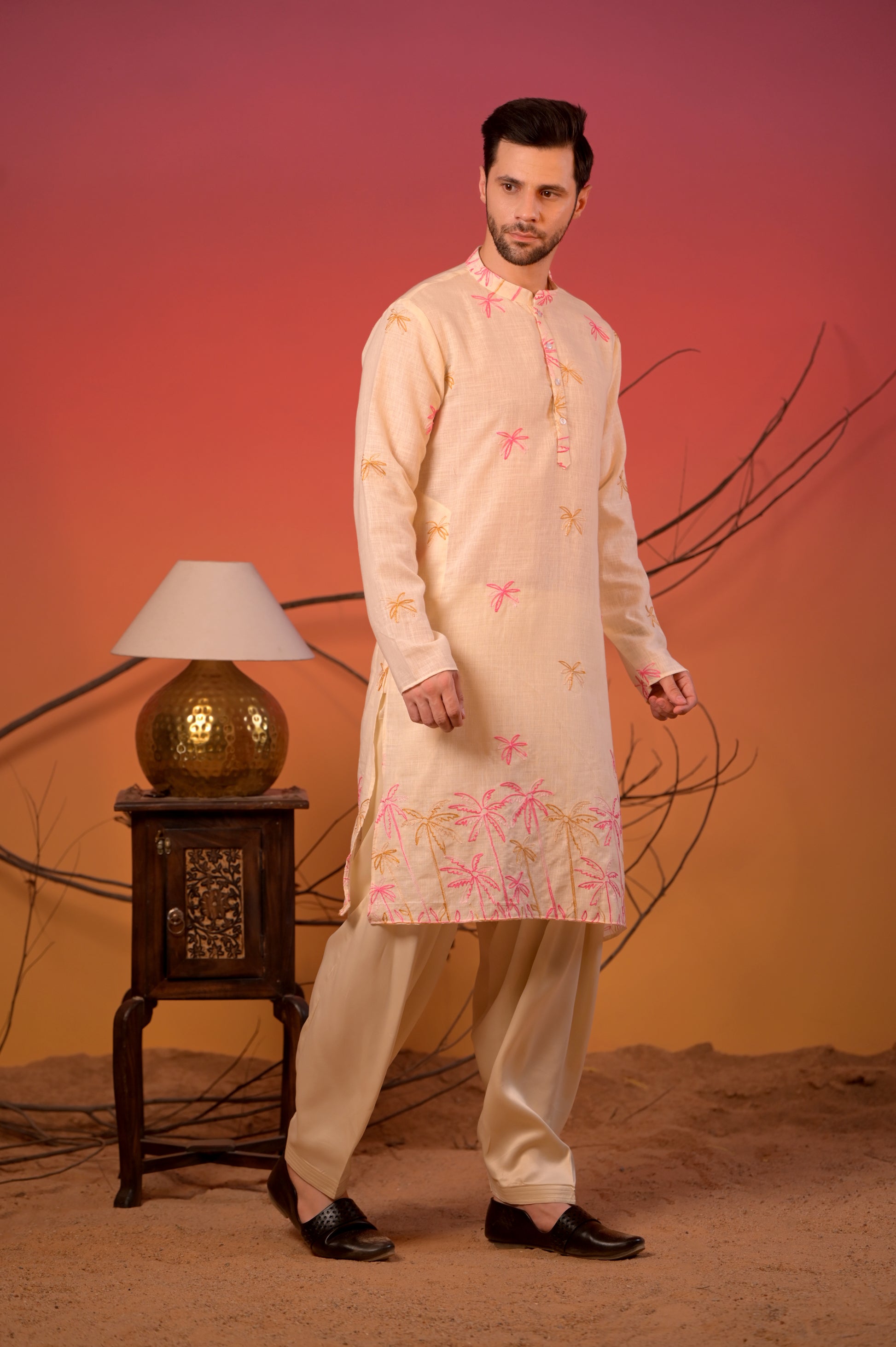 Add a playful tropical twist to your ethnic wardrobe with this beige kurta set featuring delicate palm tree embroidery in shades of pink and mustard. The lightweight fabric makes it an ideal choice for summer festivities and day weddings.