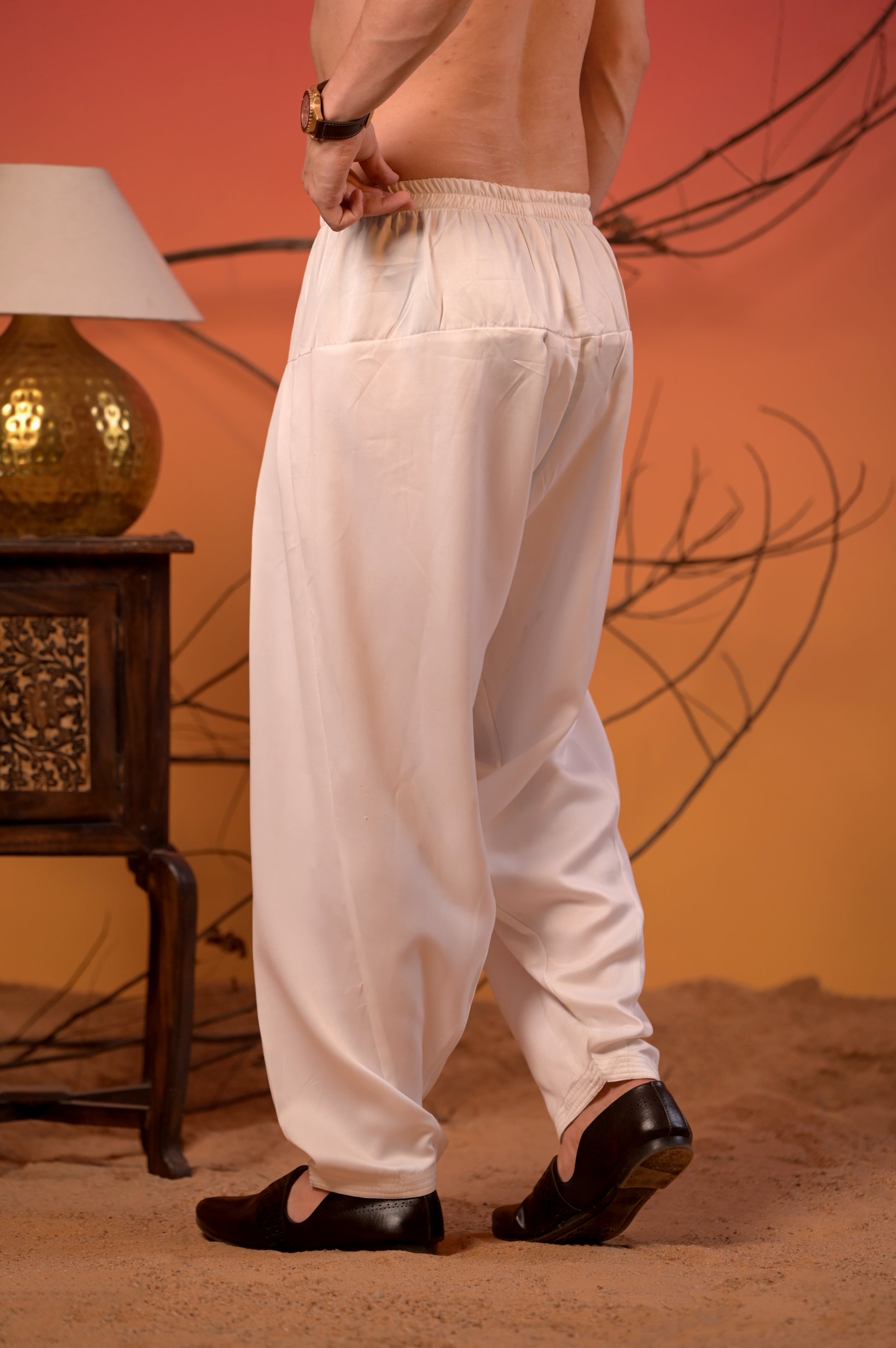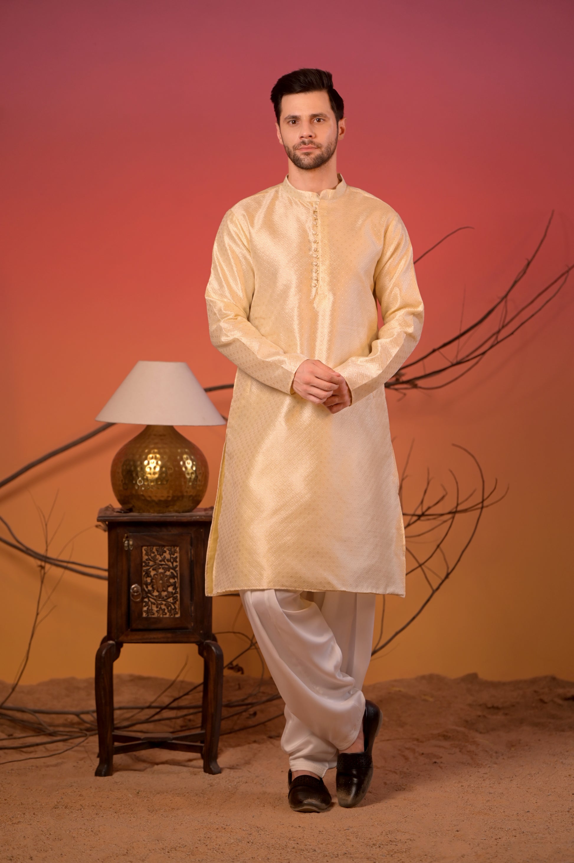 Elevate your ethnic wardrobe with this sophisticated off-white kurta set crafted from premium jacquard fabric. Featuring a refined self-woven geometric pattern that subtly catches the light, this kurta blends understated charm with festive elegance. The intricate texture adds dimension to the fabric, while the mandarin collar and classic button placket offer timeless appeal. Paired with a flowing white salwar, this ensemble is ideal for both day and evening events—comfortable, breathable, and effortlessly polished.