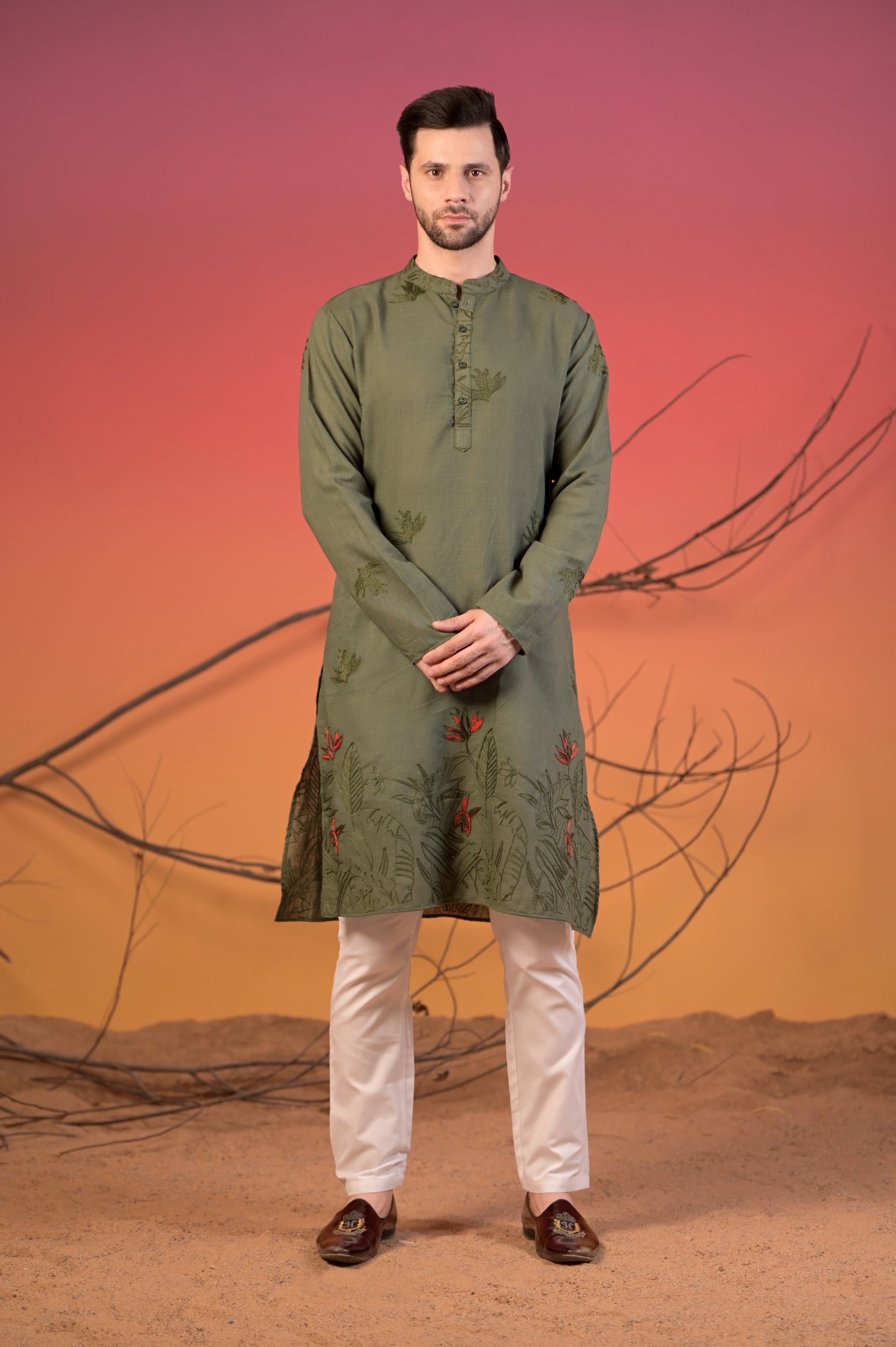 At the hem, an expressive display of scarlet-hued floral motifs blooms against deeper green foliage embroidery, evoking a lush monsoon garden. Designed for festive moments — be it a haldi celebration, Diwali dinner, or family get-together — this kurta blends old-world charm with modern finesse. Pair it with ivory churidar or tapered trousers and finish with brown mojaris or loafers for a polished ethnic look.