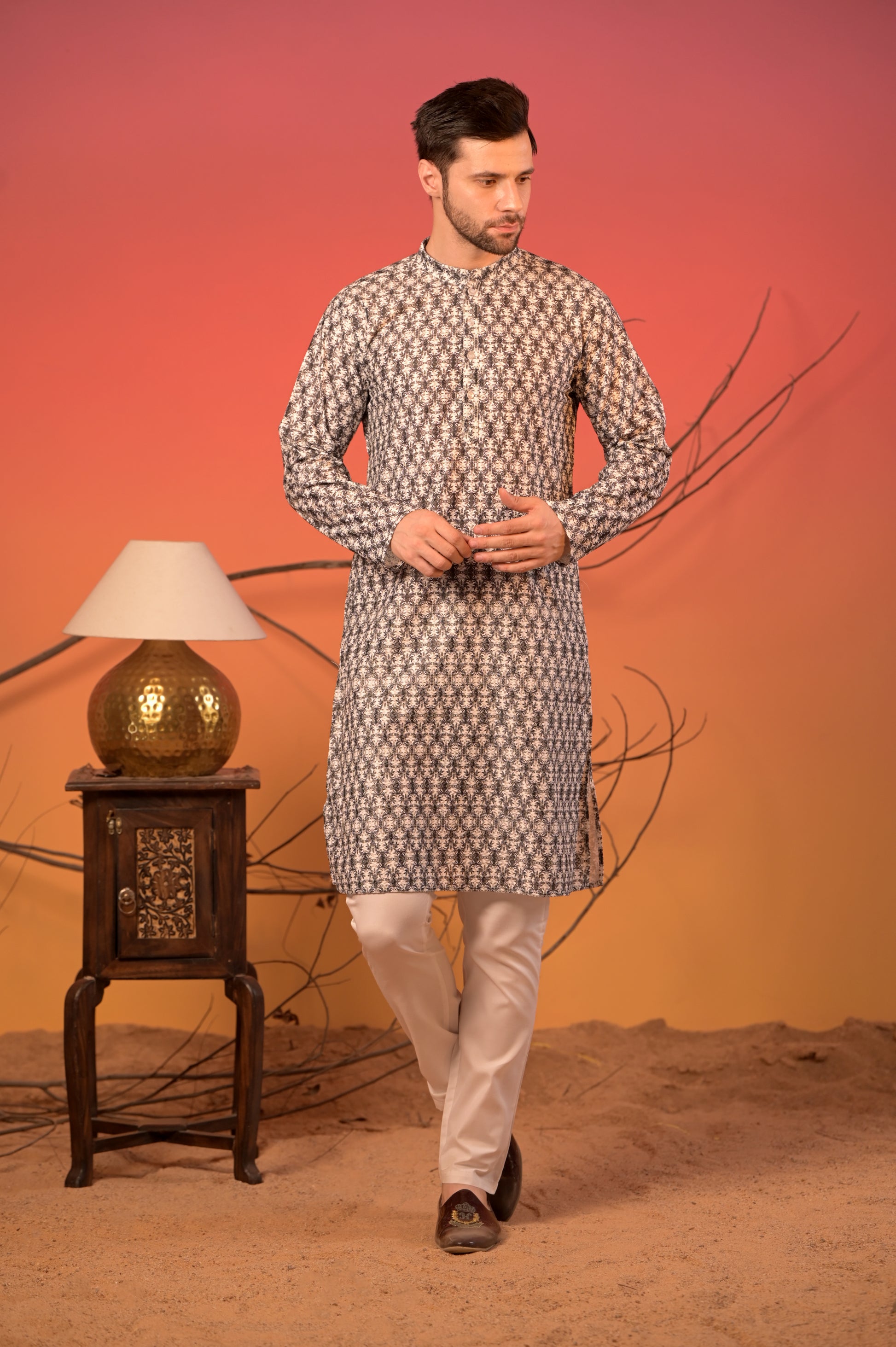 Crafted in breathable jacquard cotton, the kurta is designed with a mandarin collar and straight-cut silhouette for a classic ethnic look. Paired with ivory trousers, this ensemble is perfect for understated celebrations, formal gatherings, or weekend family affairs.