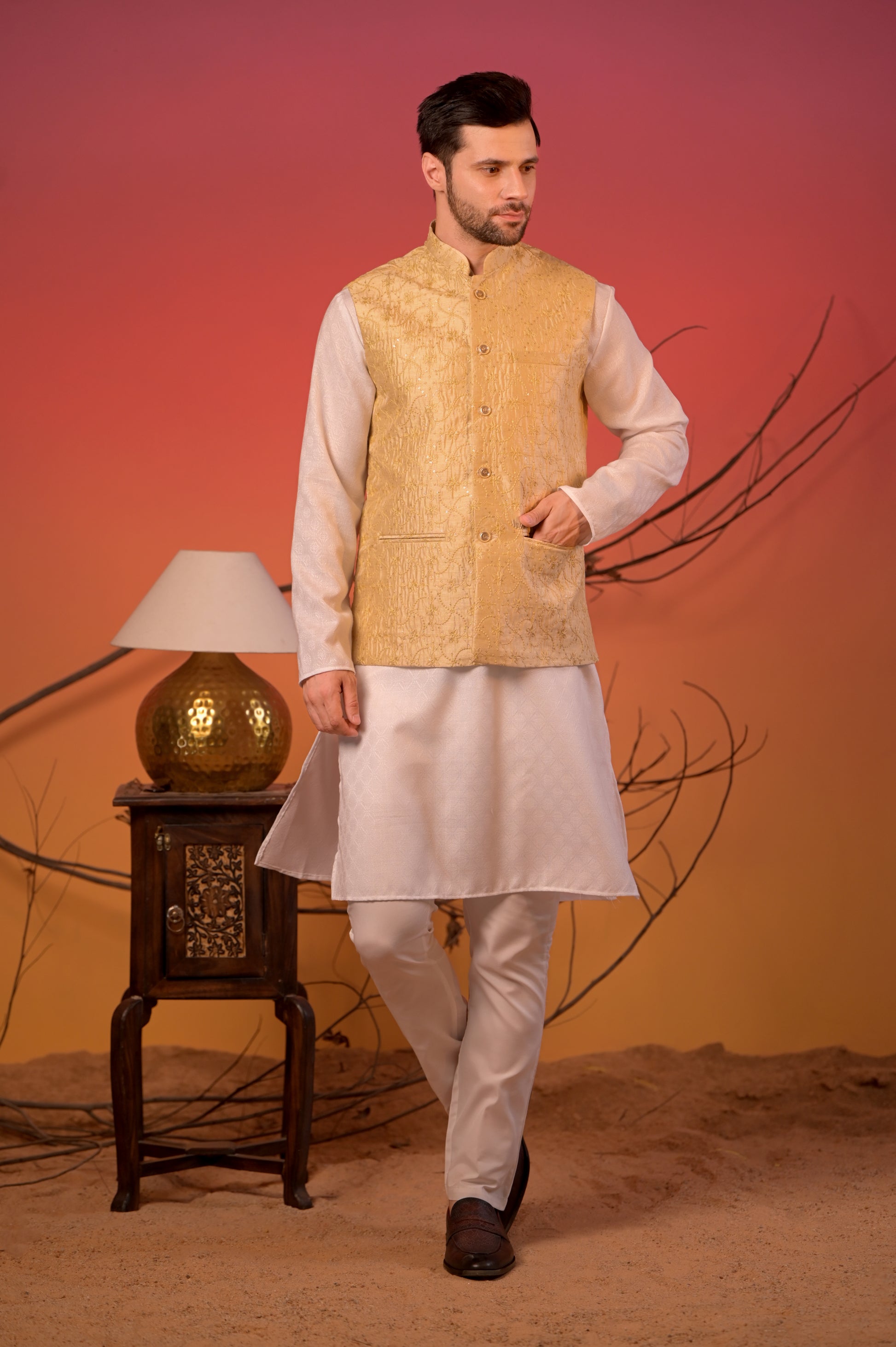White Jacquard Kurta with Golden Sequin-Embroidered Nehru Jacket & Trousers Set