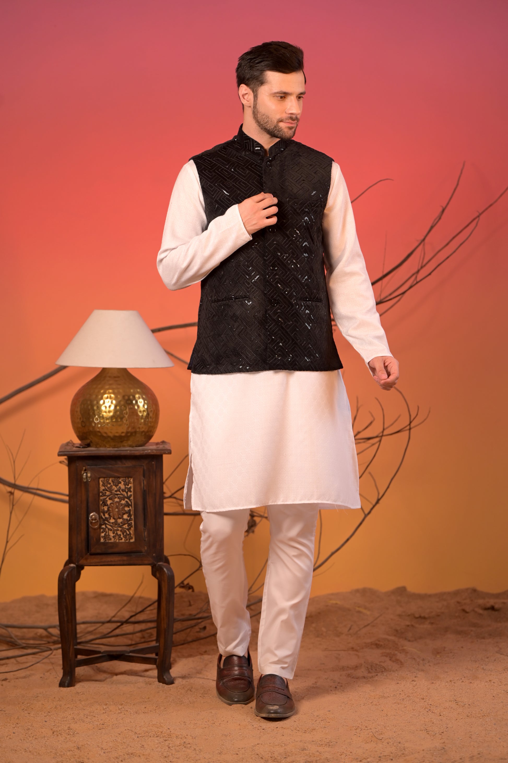 Redefine classic elegance with this pristine white kurta set elevated by a bold black velvet Nehru jacket. The kurta features a subtle jacquard weave that adds quiet sophistication, while the jacket steals the spotlight with its intricate geometric thread and sequin work over plush velvet.