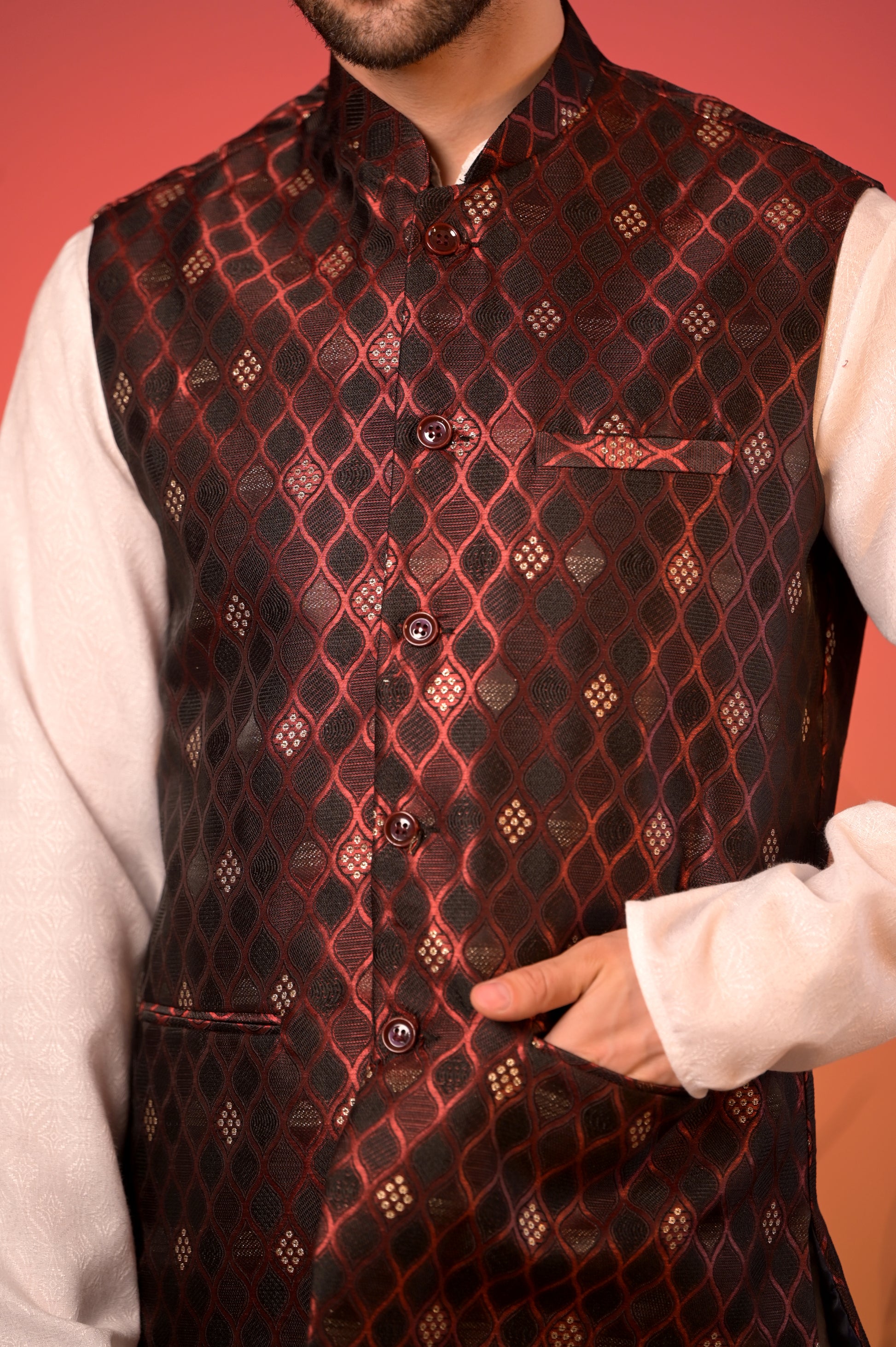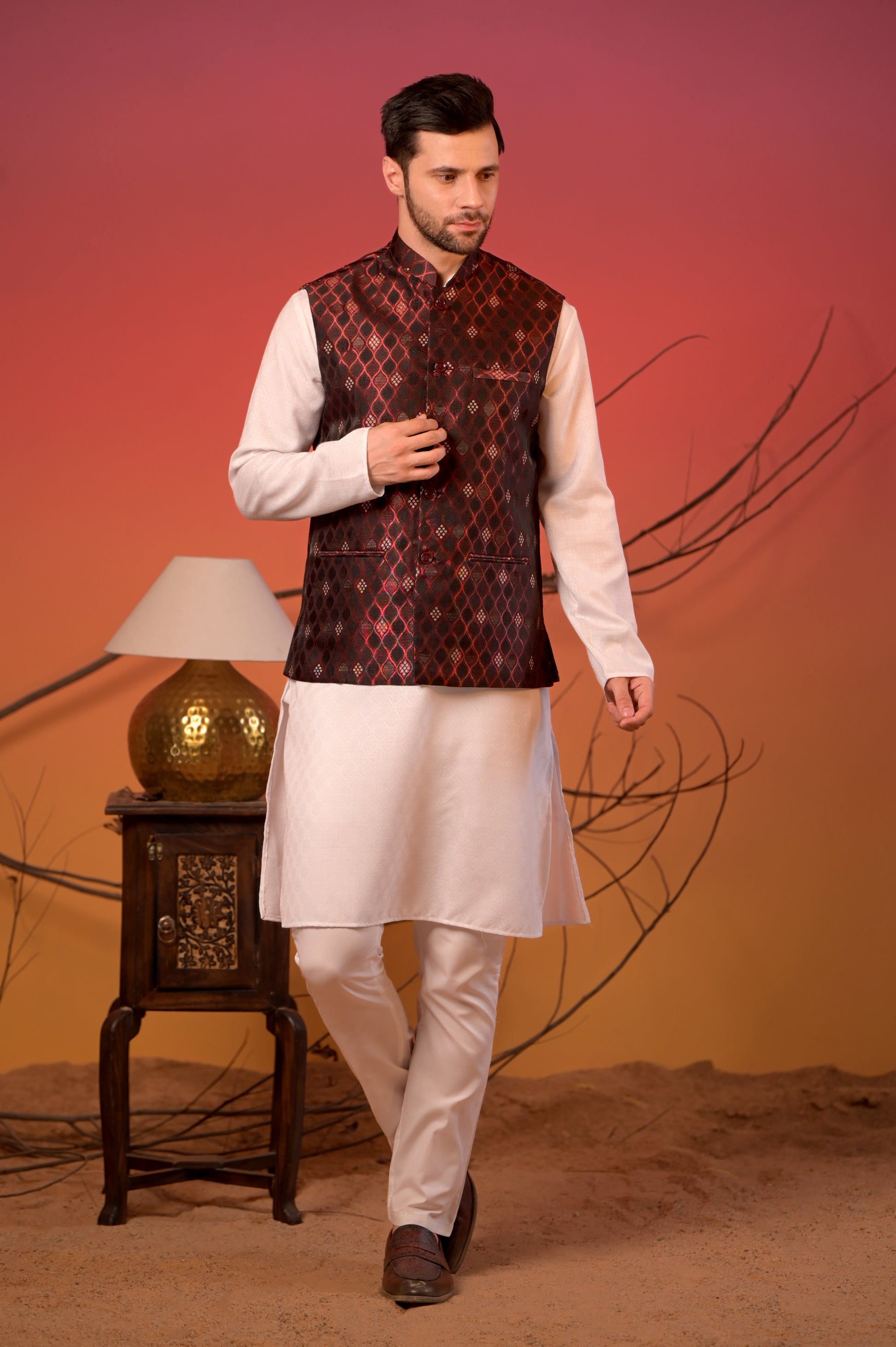 A celebration of contrast and craftsmanship, this off-white kurta set is paired with a rich maroon Nehru jacket for a bold yet balanced ethnic look. The kurta is crafted in jacquard fabric featuring a soft self-weave pattern, exuding understated elegance. The highlight is the sleeveless Nehru jacket in a deep maroon tone, intricately woven with a diamond-motif in shimmering metallic thread. The structured silhouette and glossy finish add a regal dimension to this festive ensemble, completed with classic ivory trousers. Ideal for weddings, cultural festivities, or elegant evenings, this ensemble merges heritage with a modern edge.