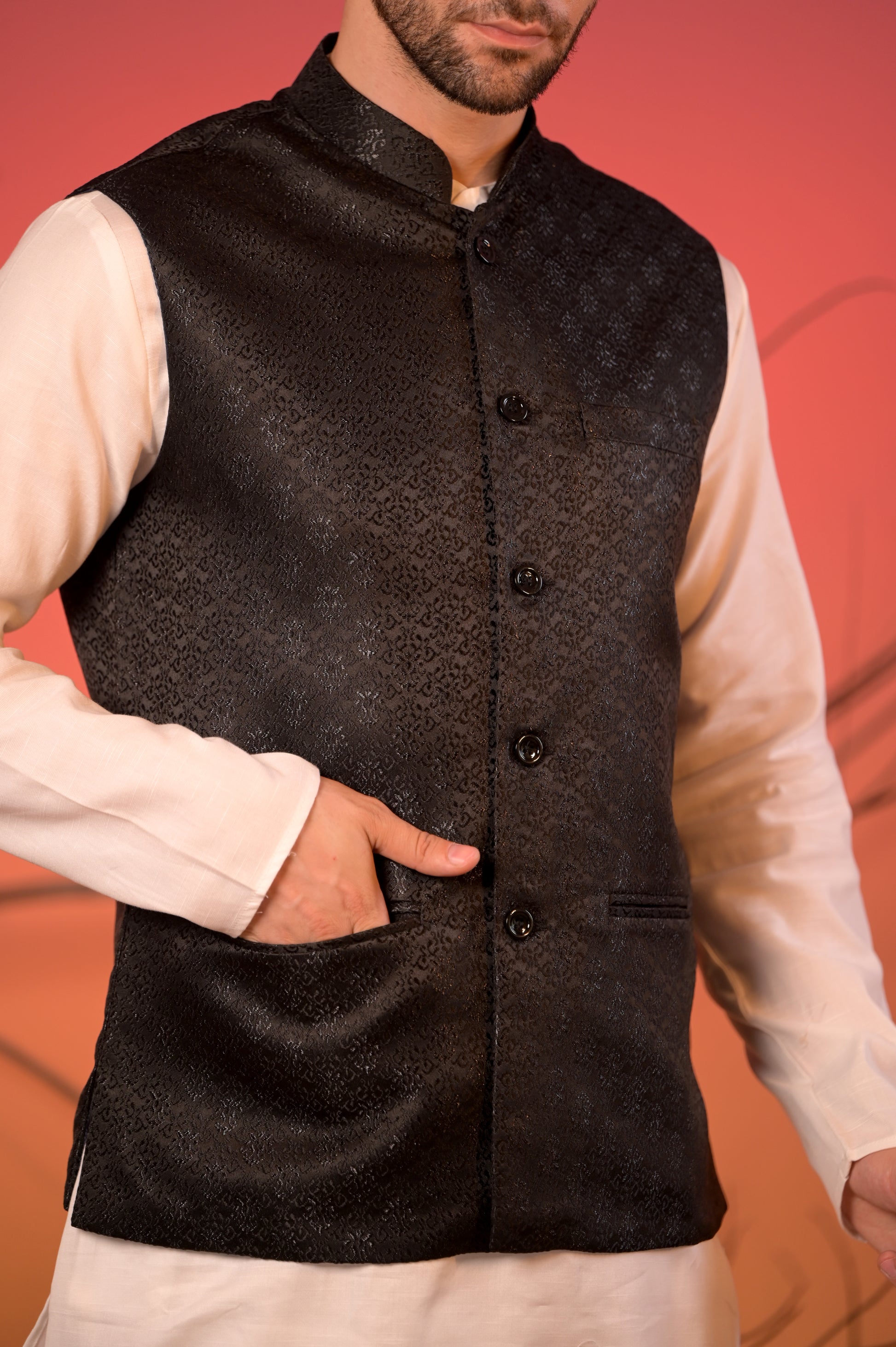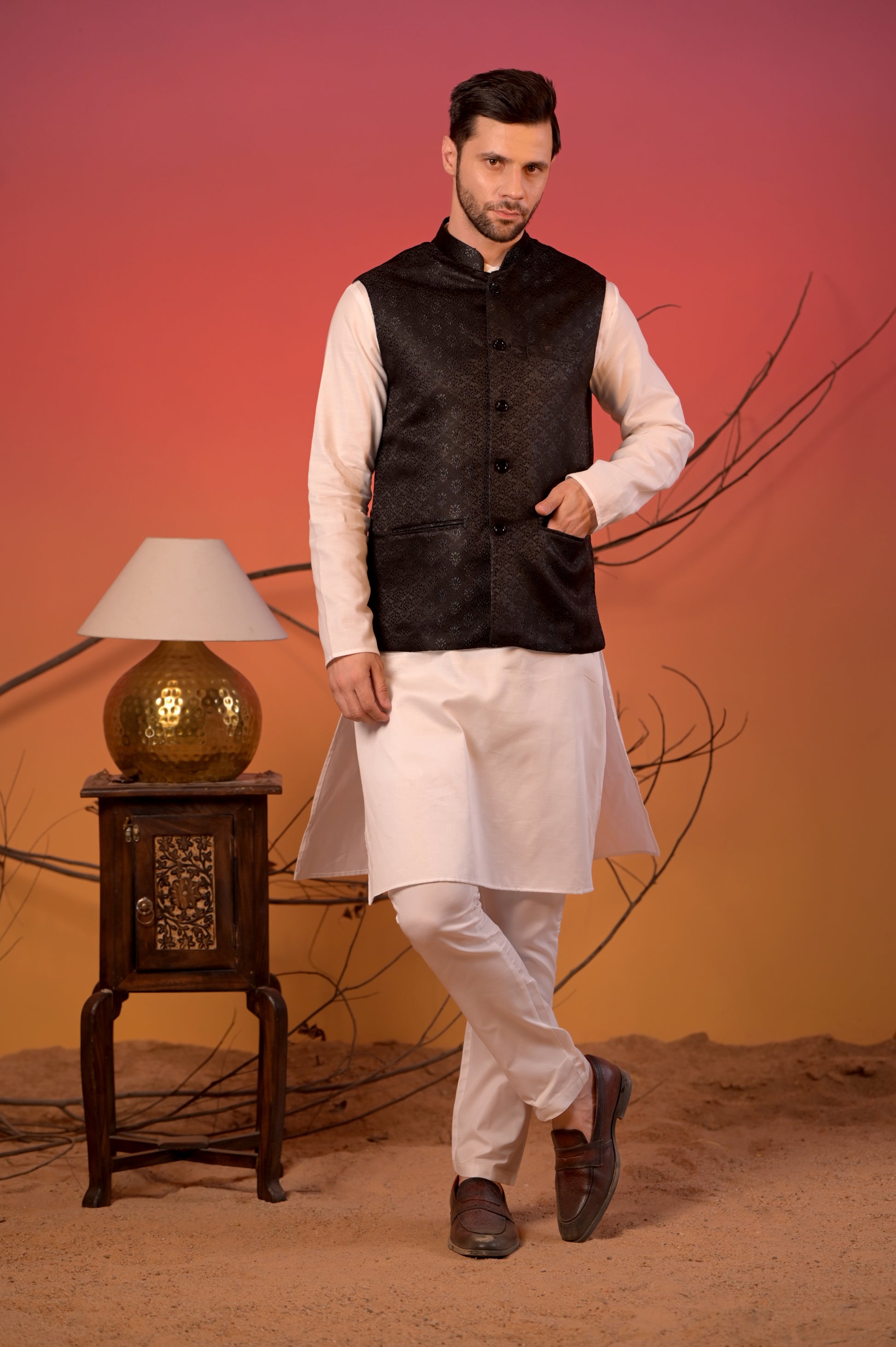 White Satin Linen Kurta with Textured Black Jacquard Nehru Jacket & Trousers Set