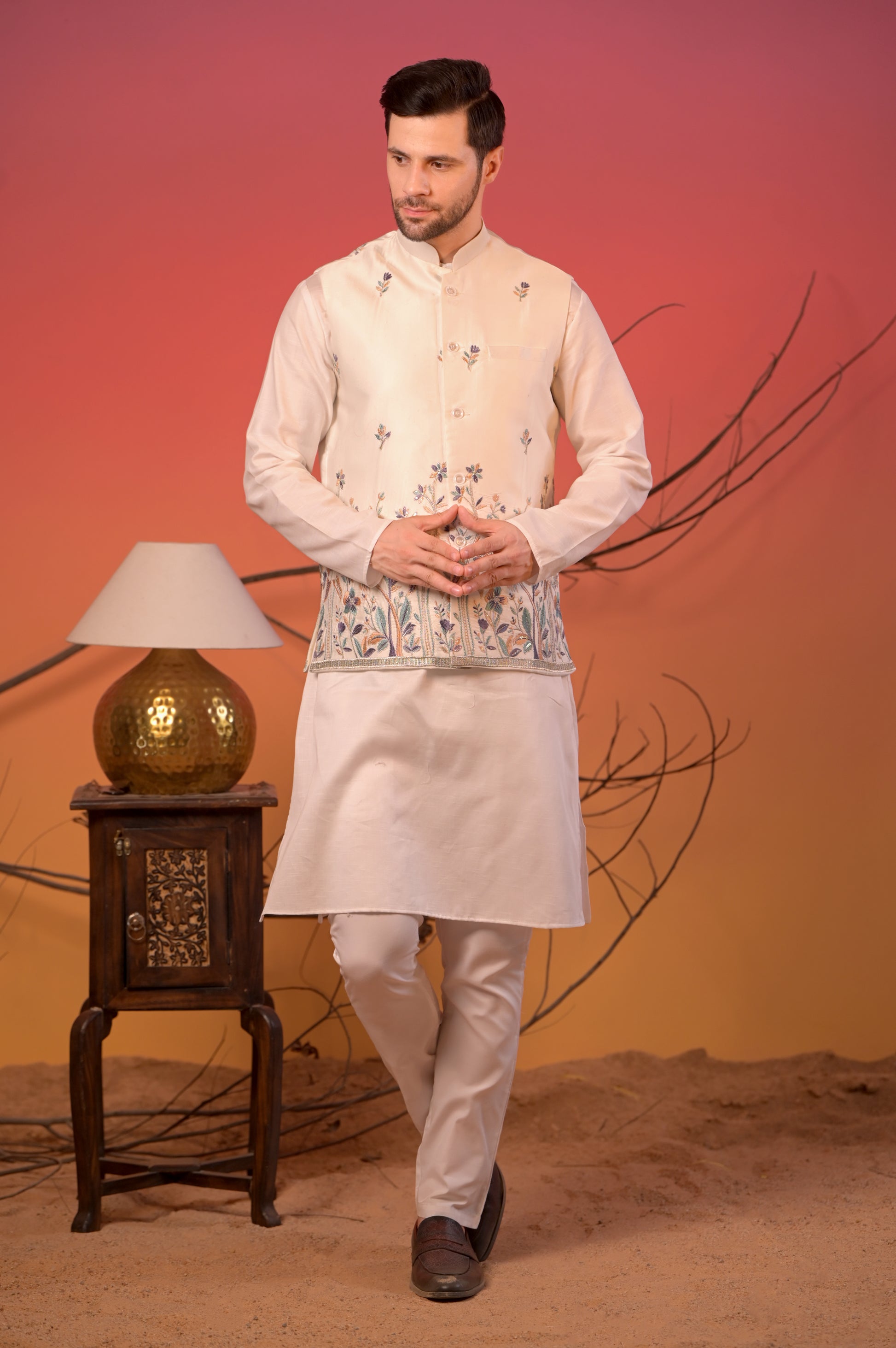 White satin Linen with Ivory Floral Embroidered Nehru Jacket & Pants Set